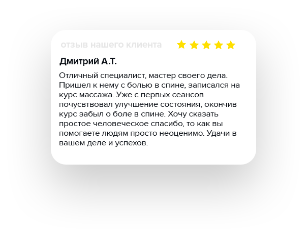 Отличный специалист, мастер своего дела. Пришел к нему с болью в спине, записался на курс массажа. Уже с первых сеансов почусвтвовал улучшение состояния, окончив курс забыл о боле в спине. Хочу сказать простое человеческое спасибо, то как вы помогаете людям просто неоценимо. Удачи в вашем деле и успехов.